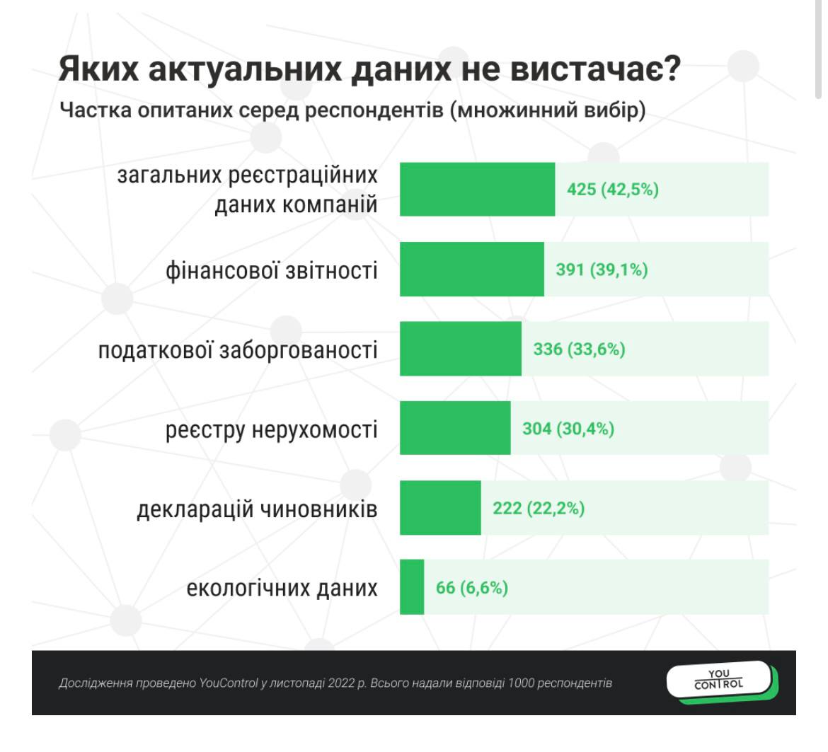 YouControl провів опитування, щоб встановити яких актуальних даних не вистачає та як відсутність реєстрів вплинула на їхню життєдіяльність. В опитуванні взяли участь 1000 респондентів (приватні підприємці, юристи, бухгалтери, фахівці з безпеки, держслужбовці)
