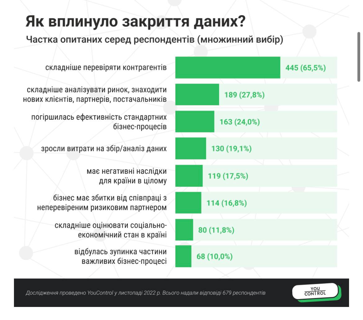Найбільш часто відмічена відповідь – "з'явилися суттєві складнощі з перевіркою контрагентів". Про такий негативний фактор зазначили 66% респондентів з 679 осіб, які відповіли на дане питання. Також поширеною стала проблема аналізу ринків, пошуку нових клієнтів, партнерів та постачальників – 28%. Для 24% погіршилась ефективність стандартних бізнес-процесів. Також серед суттєвих проблем: зростання витрат на збір та аналіз даних, збитки бізнесу від співпраці з неперевіреними ризиковими партнерами, зупинка частини важливих бізнес-процесів. 18% респондентів відзначили, що закриття низки публічних реєстрів має негативні наслідки для країни в цілому.