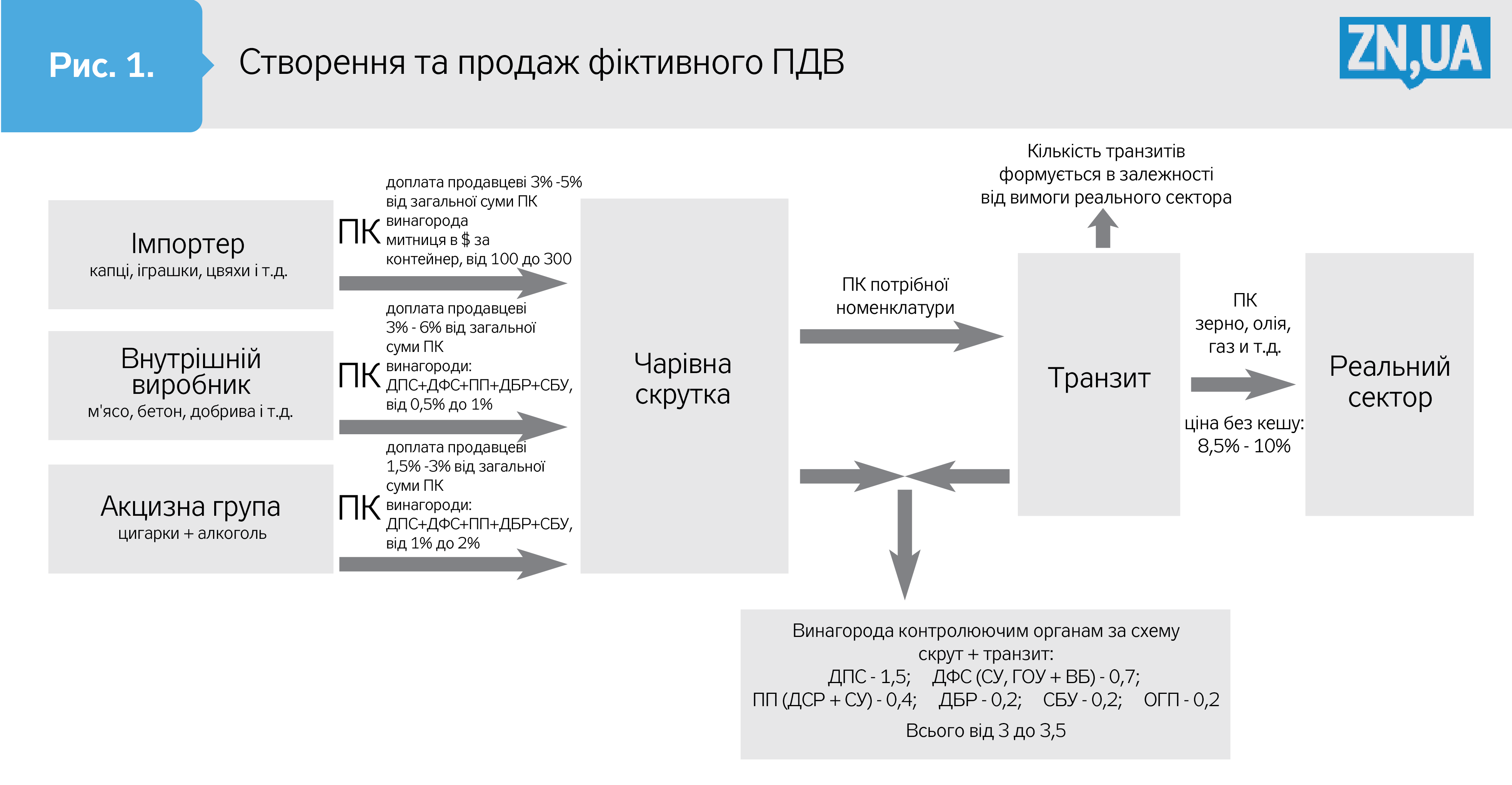 За даними ZN.UA, станом на лютий конвертаційно-транзитних центрів в Україні було близько 600. Тож, перелік вигодонабувачів їхньої роботи точно не буде вичерпним. До того ж, робота конвертаційних центрів неможлива без участі співробітників податкової служби та зазвичай, як і контрабанда, "контролюється" усіма від нацполіції до СБУ. Розцінки на малюнку 1.