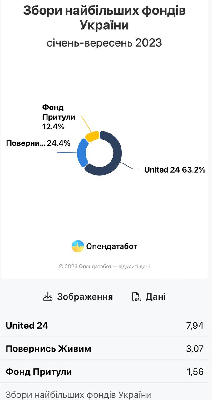 Зокрема платформа United24 – 7,94 млрд грн або 63% від загального обсягу. Майже чверть коштів – трохи більше 3 млрд грн – отримав фонд "Повернись живим", ще близько 1,5 млрд грн (12%) надійшло до фонду Сергія Притули.