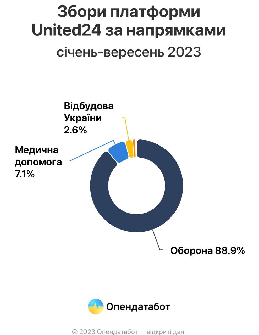Зазначається, що найбільше пожертв надійшло для потреб ЗСУ – 7,06 млрд грн (89% від загального обсягу). У травні 2023 року платформа United 24 розпочала збори за двома новими напрямами — на гуманітарне розмінування та потреби освіти і науки. Протягом п’яти місяців на відповідні рахунки було перераховано 31 млн грн на 76 млн грн.