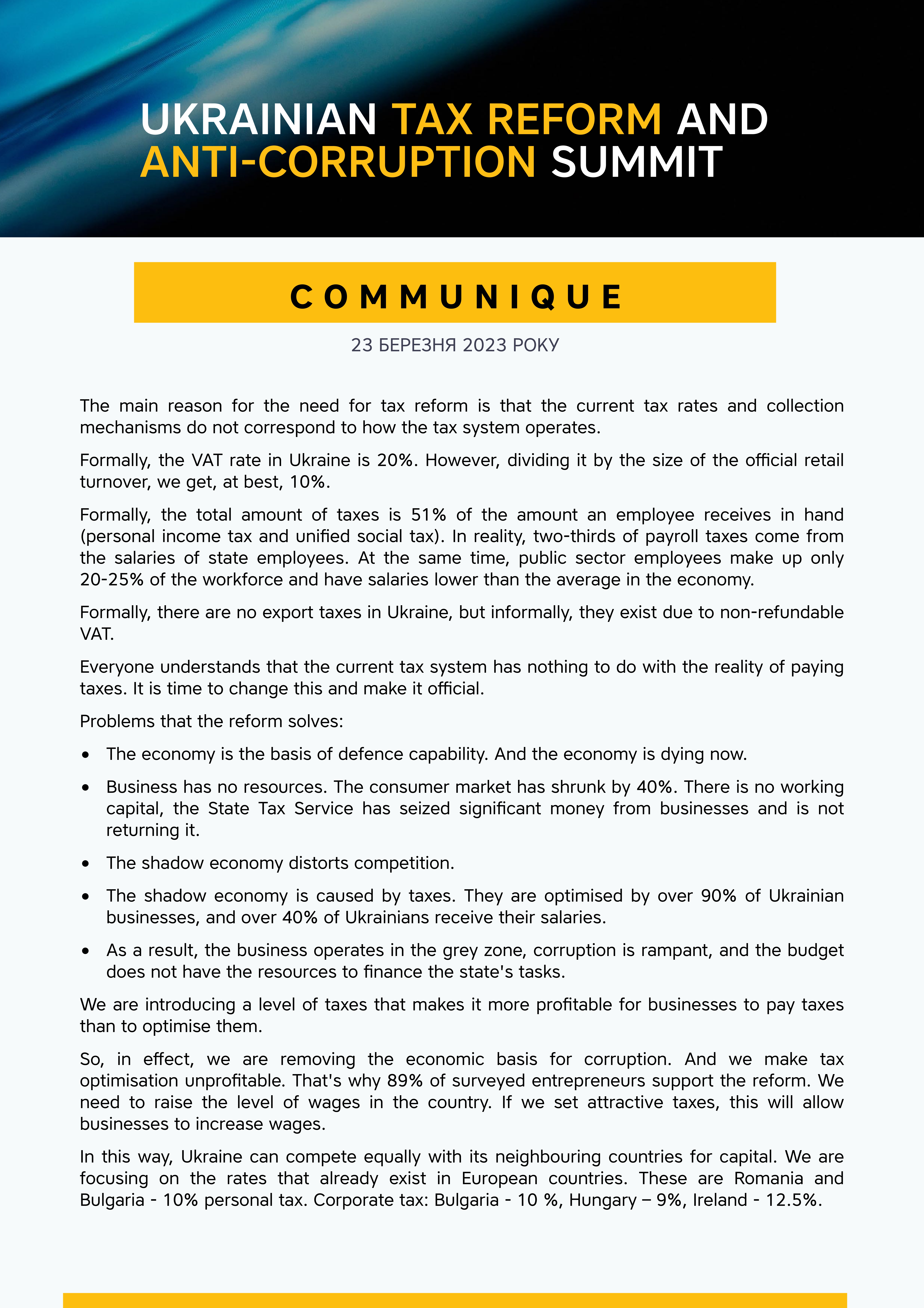 Про це йдеться в комюніке від організаторів конференції Ukrainian Tax Reform And Anti-corruption Summit 2023, яка пройшла 23 березня в Києві за участі українських та зарубіжних підприємців та економічних експертів.
