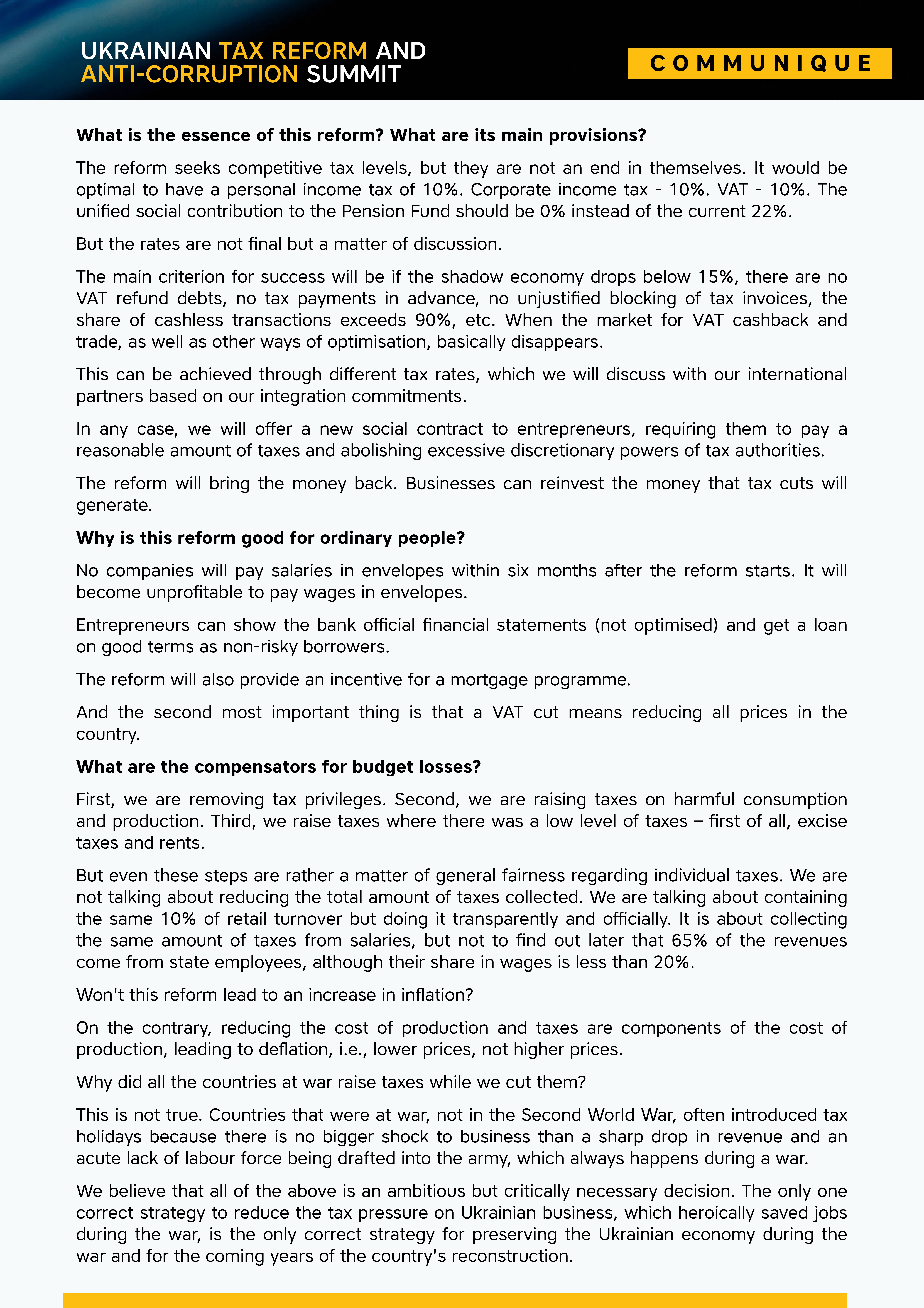Підкреслюється, що проєкт антикорупційної податкової реформи має на меті вирішити такі проблеми, як недостатня продуктивність фінансової системи під час бойових дій, скорочення споживчого ринку, тотальна “оптимізація” фіскального навантаження бізнесом та постійне зростання тіньового сектору економіки. Критеріями успіху реформи вважатимуться падіння частки тіньової економіки нижче 15%, відсутність заборгованості з відшкодування ПДВ, відмова від сплати податків авансом, зупинка безпідставного блокування податкових накладних, підвищення частки безготівкових операцій до 90%.