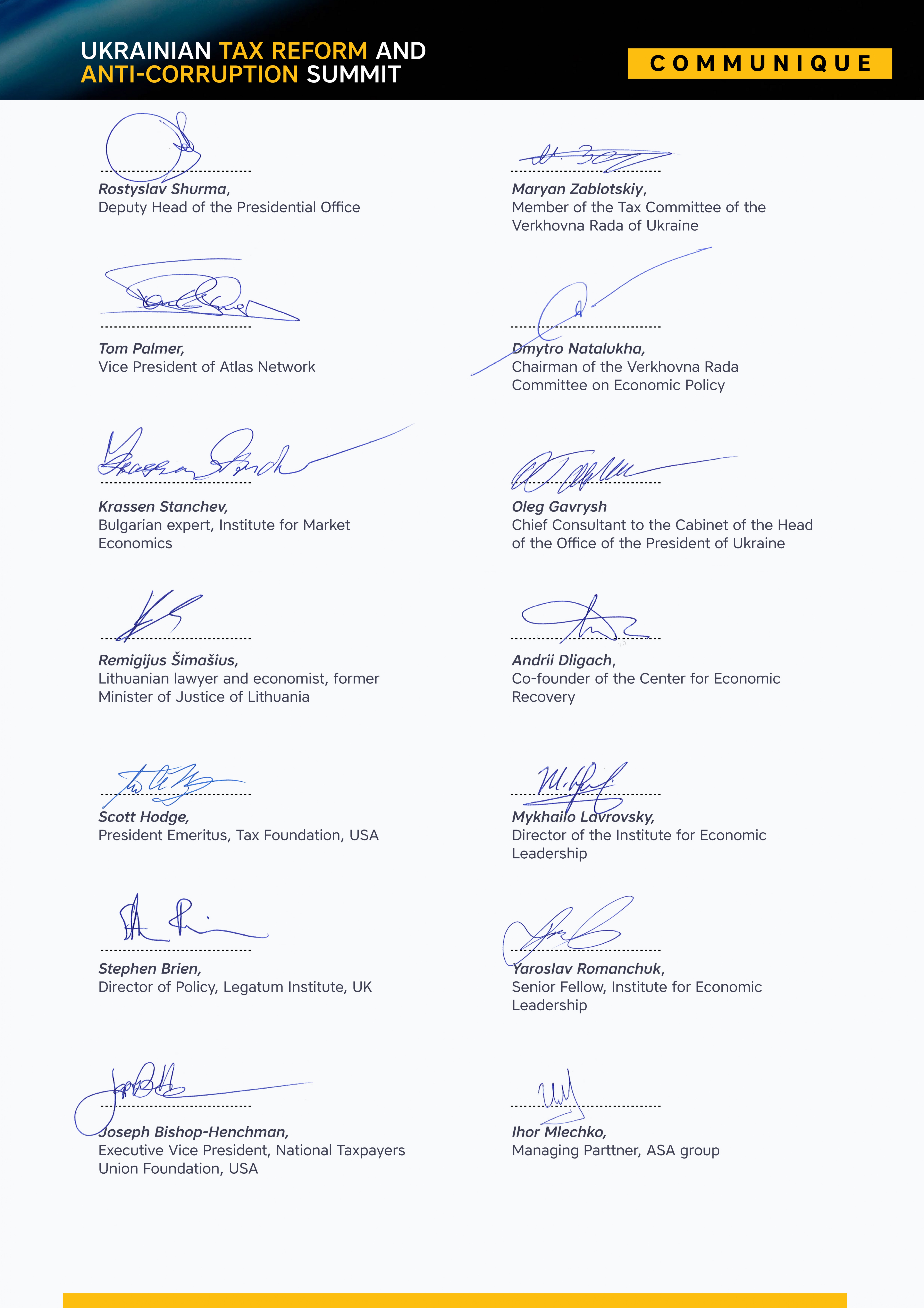 Під документом свої підписи поставили Виконавчий віце-президент Національної спілки платників податків США Джо Бішоп-Хенчман, Почесний президент і старший радник з питань політики у Фонді оподаткування США Скотт Ходж, заступник голови Офісу президента Ростислав Шурма, віцепрезидент Atlas Network Том Палмер, голова комітету з питань економічного розвитку у Верховній Раді України Дмитро Наталуха, член Комітету Верховної Ради з питань фінансів, податкової та митної політики Мар’ян Заблоцький та багато інших.