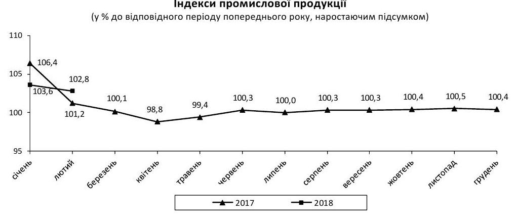 Обсяги промислового виробництва в лютому 2018 року зросли порівняно з аналогічним місяцем минулого року на 1,9%, повідомляє Державна служба статистики України.