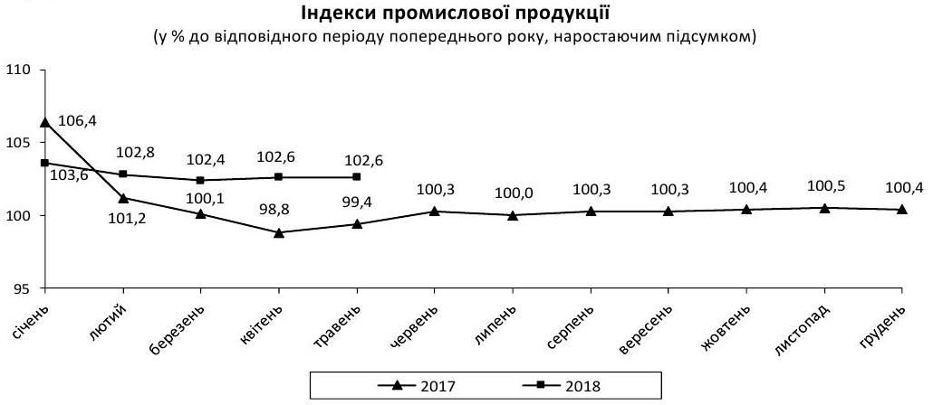 Обсяги промислового виробництва в травні 2018 року зросли порівняно з аналогічним місяцем минулого року на 2,5%, повідомляє Державна служба статистики України.