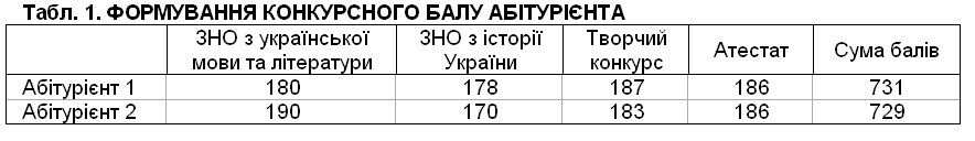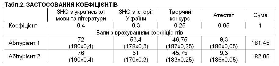 У таких умовах вищі шанси вступити до навчального закладу має Абітурієнт 1, оскільки його бал вищий. Якщо ж конкурсний бал обраховуватиметься з урахуванням коефіцієнтів, і ВНЗ правилами прийому передбачить, що найвищий коефіцієнт присвоюватиметься результату ЗНО з української мови і літератури (0,4) та історії України (0,3), то студентом стане Абітурієнт 2, оскільки його конкурсний бал - 182,05 - вищий, ніж в Абітурієнта 1: 181,45. Для визначення конкурсного бала ми множили кожну його складову на відповідний коефіцієнт, враховуючи допустиму вагу.