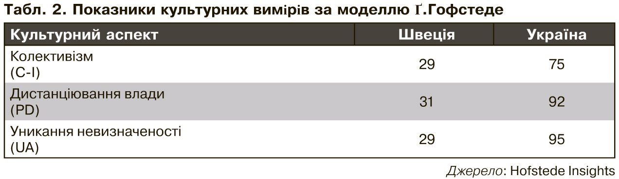 Порівняльний аналіз ціннісних орієнтацій за іншою моделлю культурних вимірів, яку розробив Ґ.Гофстеде (2001), дозволяє побачити соціально-психологічні фактори, що підсилюють процес самовідтворення культури виживання в Україні, зокрема в її освітянських колах. Це високий рівень колективізму, дистанціювання влади й уникання невизначеності. У таблиці 2 показано, як ці культурні аспекти (вимірювані за шкалою від 0 до 100) співвідносяться в Україні і Швеції.