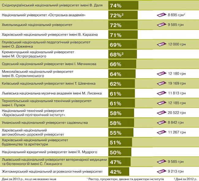 Проблема дисбалансу зарплатні у вищій школі не надумана, і стосується вона не лише привілейованих вишів, а широкого загалу. Новому керівництву МОН відомо про неї, адже перший заступник міністра Інна Совсун перед своїм призначенням очолювала Центр дослідження суспільства, який у лютому оприлюднив досить цікаві дані про видатки наших національних університетів. Зокрема, йшлося і про розподіл фондів оплати праці. Попри те, що інформація охоплює далеко не всі національні ВНЗ, - чимало їх проігнорували запити на доступ до публічної інформації, - певні висновки зробити можна. Фахівці Центру порівняли зарплатню різних ланок університетських працівників. Як з'ясувалося, у деяких ВНЗ середня зарплатня викладача вдвічі нижча, ніж середній заробіток університетського керівництва. Загалом, викладачі 37 різних національних університетів із Києва, Харкова, Львова, Одеси, Вінниці, Миколаєва, Запоріжжя, Івано-Франківська, Хмельницького та інших міст отримують на 50-163% нижчу зарплатню, ніж їхні ректори, проректори та декани (див. рис.).