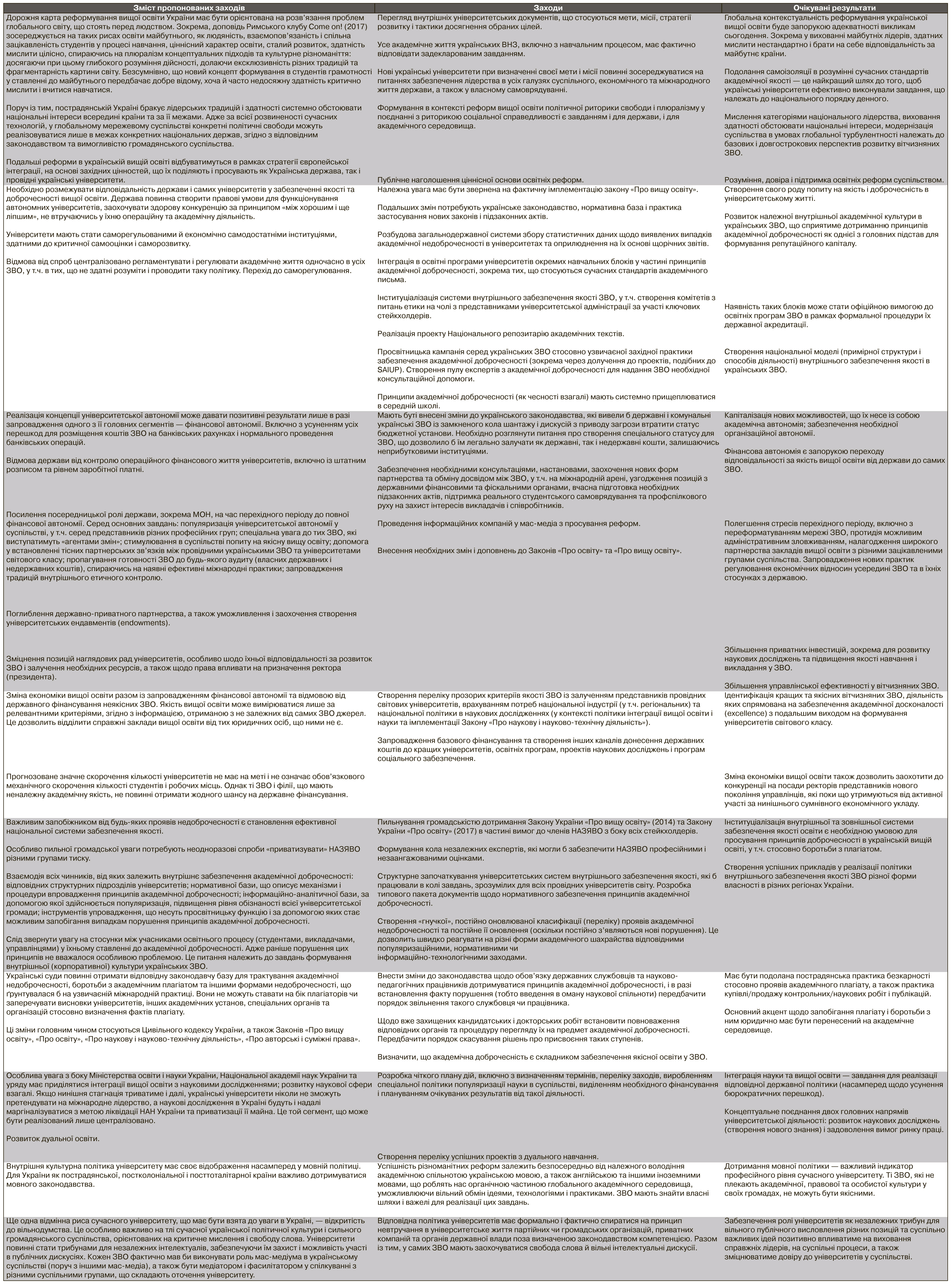 Порядок денний подальшого реформування української вищої освіти має спиратися на розуміння громадського (суспільного, публічного) інтересу, що одночасно виступає частиною національних інтересів української держави. Громадський інтерес полягає в тому, що українське суспільство потребує сильних автономних університетів, на основі яких можна буде створити університети світового класу. Ці ЗВО перебували б у центрі всіх економічних, політичних та суспільних змін нашої держави. Для просування такого порядку денного необхідно об'єднати зусилля уряду, громадськості, експертного середовища й медіа.