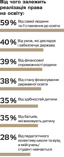 Більшість учасників дослідження вважає, що право на освіту пов'язане з її доступністю. Для його реалізації важливо, щоб кожен мав змогу отримати безкоштовно повну загальну середню освіту (86% респондентів), а також обрати за бажанням спеціальність і вищий навчальний заклад (89%). Можливість отримати цільовий пільговий кредит на здобуття вищої освіти вважають важливою умовою для реалізації права на освіту 49% учасників дослідження.