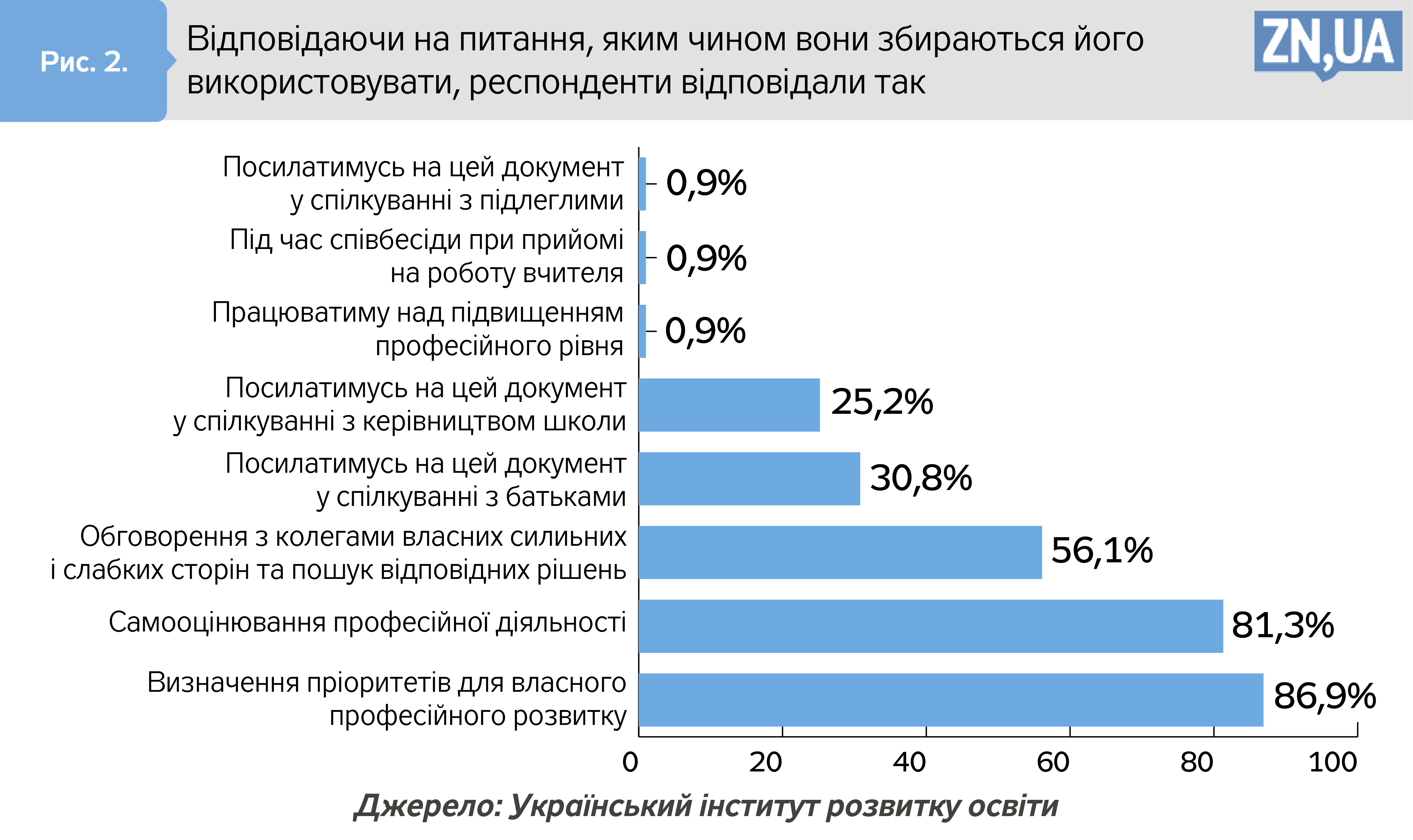 Важливо зазначити, що під час створення професійного стандарту вчителя проводилося опитування серед учителів і керівників шкіл, які беруть участь у пілотуванні Державного стандарту початкової освіти. Крім запитань, котрі стосувалися змісту професійного стандарту, опитувальник містив запитання, як учителі й керівники бачать використання цього стандарту у своїй професійній діяльності та чи мають намір використовувати його взагалі.
