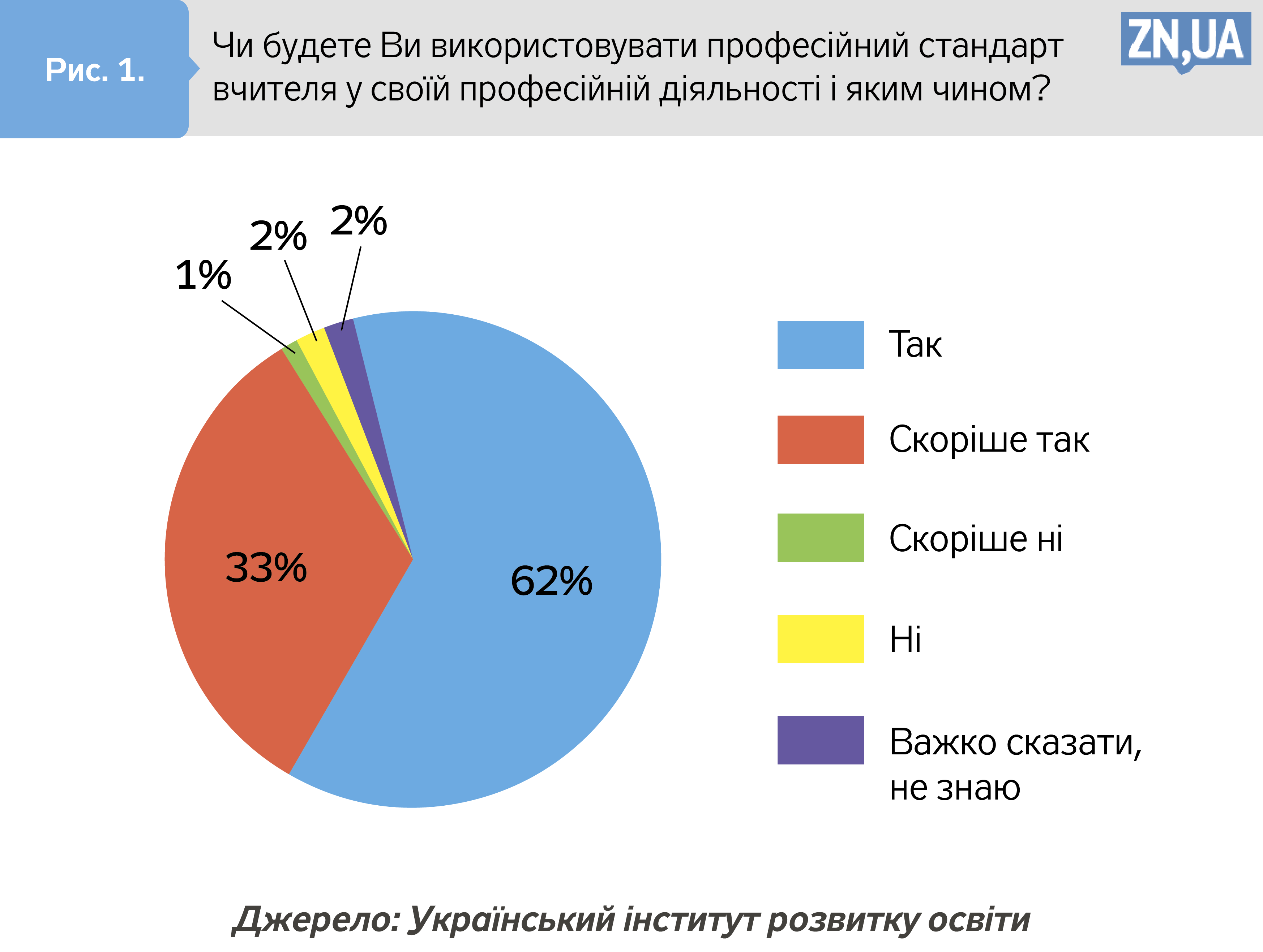 Приємно, що на запитання «Чи будете ви використовувати професійний стандарт вчителя у своїй діяльності і якщо так, яким чином?» 62% респондентів відповіли «Так» і 33% — «Скоріше, так». Отже, ми бачимо, що переважна більшість учителів і керівників шкіл бачать практичну цінність цього документа.