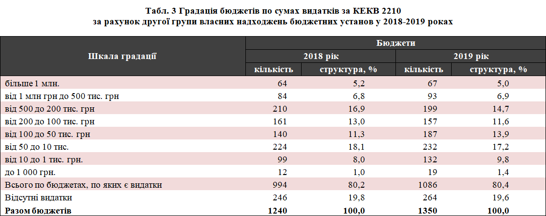 У таблиці 3 наведемо градацію бюджетів за сумами видатків за КЕКВ 2210 у 2018–2019 роках за рахунок другої групи власних надходжень бюджетних установ.