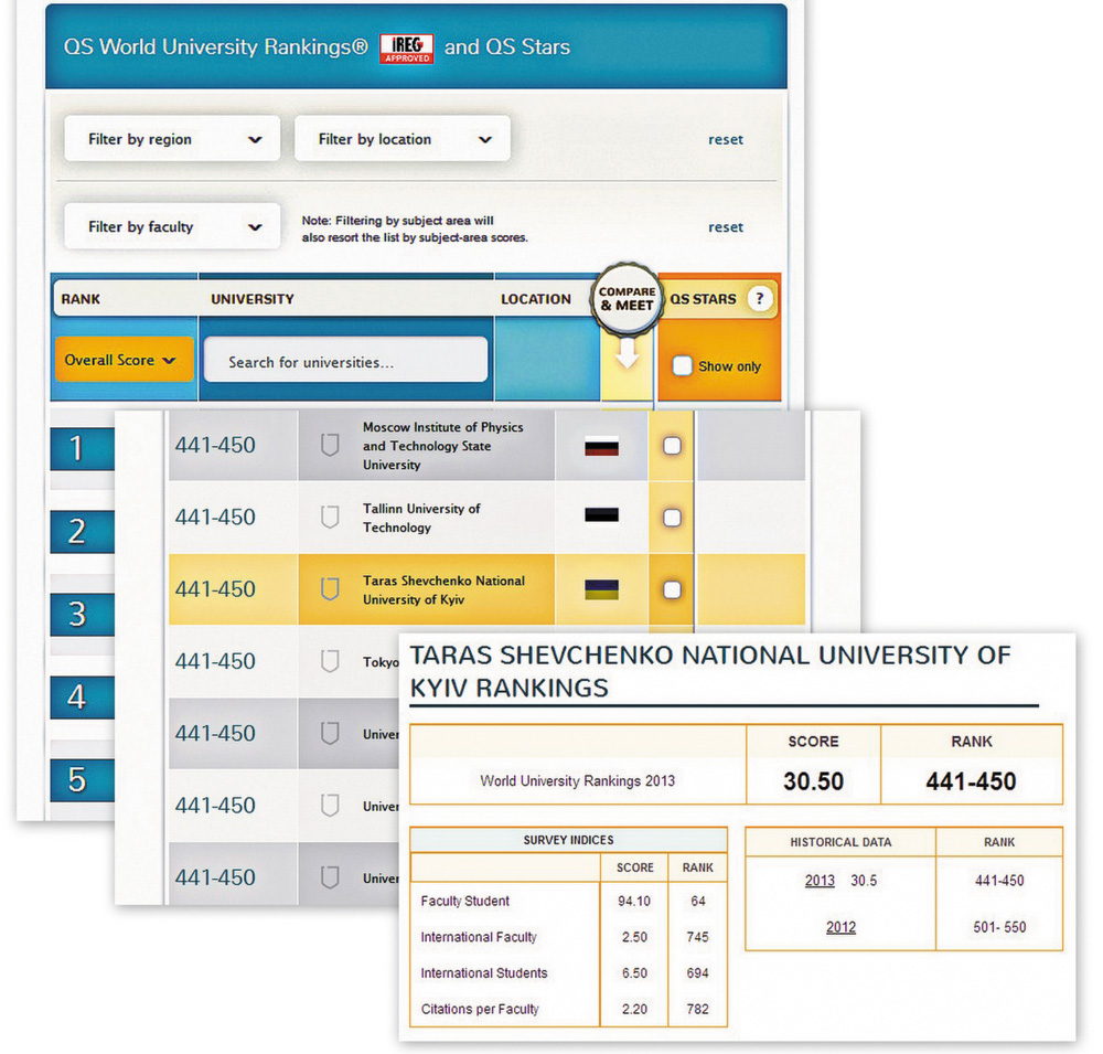 Британська компанія QS Quacquarelli Symonds презентувала рейтинг найкращих вузів світу-2013. Уже традиційно українські вищі навчальні заклади опинилися у хвості списку, втім, Київський національний університет імені Тараса Шевченка зміг перейти з групи "501-550" у "441-450", потрапивши, таким чином, у Топ-500. Перші рядки авторитетного рейтингу, автори якого проаналізували понад 700 вузів світу, посіли університети Великобританії та США. Лідер списку - Массачусетський технологічний інститут, на другому місці - Гарвардський університет, на третьому - Кембриджський університет.