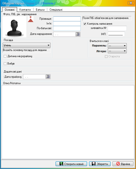 На сайтіТОВ "Нові знання",яке продає школам ліцензійне програмне забезпечення для формування звітності і здійснює технічну підтримку інформаційної системи, є презентація "Внесення даних школи". Вона містить рекомендації для тих, хто складає звітність у кожному навчальному закладі. Ось зразок електронної облікової картки учня, продемонстрований у презентації на офіційному сайті ТОВ "Нові знання".