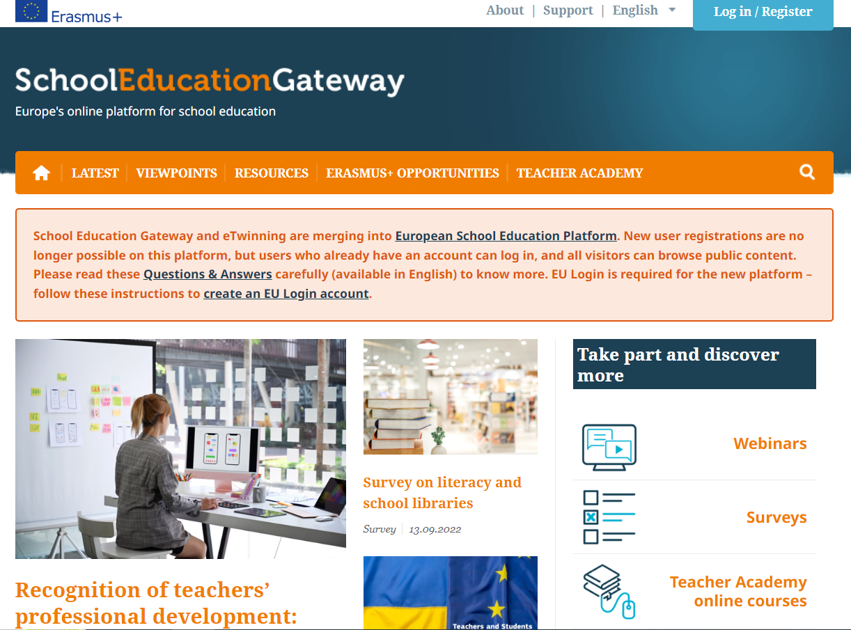 Однак використання ресурсів School Education Gateway — виклик для українських учителів, адже їм потрібно мати достатній рівень англійської мови, навички з цифрових технологій і володіння сучасними методами викладання й навчання в цифровому форматі, щоб донести актуальну інформацію до учнів і навчити їх використовувати сучасні цифрові ресурси в освітньому процесі. Наразі, в умовах війни, саме такі компетентності вчителя необхідні для забезпечення якісного освітнього процесу в дистанційному форматі.