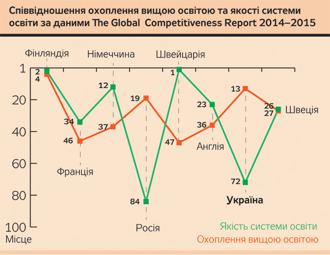 Вже традиційно у Глобальному рейтингу конкурентоспроможності Україна посідає високі місця за показником "охоплення вищою освітою" і значно нижчі- за показником "якість вищої освіти". На відміну від країн-лідерів освіти, які демонструють високі показники якості при нижчому охопленні вищою освітою або відповідності цих двох показників.