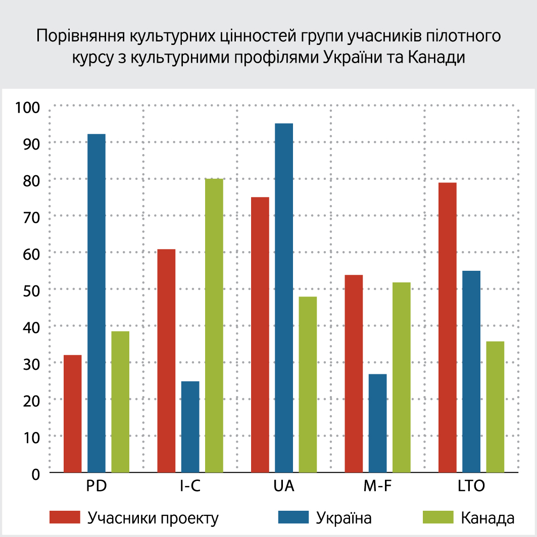 У результаті опитування ми отримали культурний профіль групи студентів, який порівняли з національними культурними профілями країн-учасниць проекту - України та Канади, - представленими на офіційному сайті Хофстеде-центру.