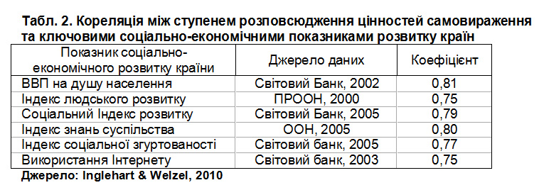 Хоч би як патетично це звучало, та утвердження цінностей самовираження має досить прагматичне значення, великою мірою впливаючи на модернізаційні процеси в суспільстві. Так, дослідження World Values Survey (Inglehart & Welzel, 2010) виявило високу кореляцію між поширенням серед населення країни цінностей самовираження, як-то повага до особистості, прав людини, гендерної рівності, особистого успіху (на противагу цінностям виживання: ксенофобії, нехтування свободами і правами людини, готовності прийняти авторитаризм і корупцію, покірності, нетерпимості до інакодумства) та ключовими показниками соціально-економічного розвитку.