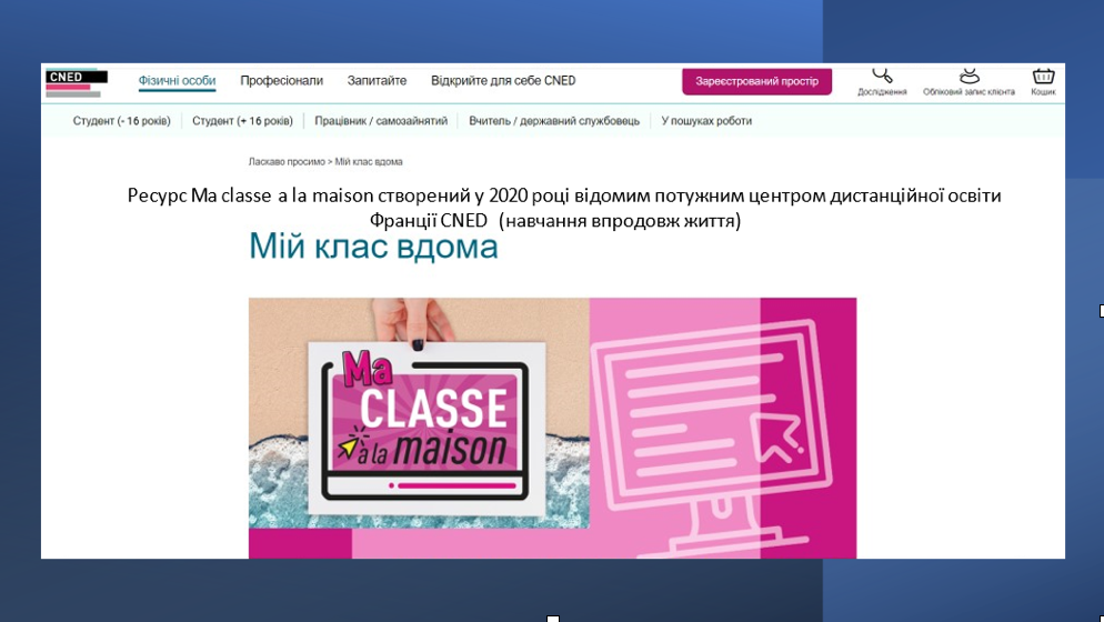 Розглянемо французьку освіту. В цій країні багато років розвивалося дистанційне навчання для всіх категорій населення, «освіта впродовж життя», у CNED — відомому центрі дистанційного навчання. У 2020 році на базі цього центру французи дуже швидко створили цифрову платформу «Мій клас — удома», на якій давали учням, учителям і батькам цифрові курси, відеоуроки, навчальні тести, різноманітні освітні матеріали та іншу допоміжну інформацію.