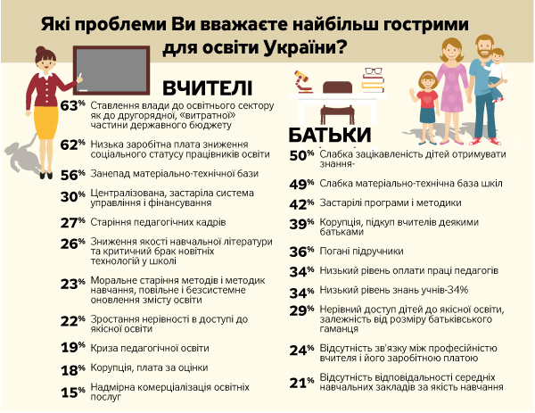 Природно, що вчителі і батьки дещо по-різному уявляють собі піраміду найгостріших проблем середньої освіти. Розглянемо ТОП-10 найпопулярніших відповідей.