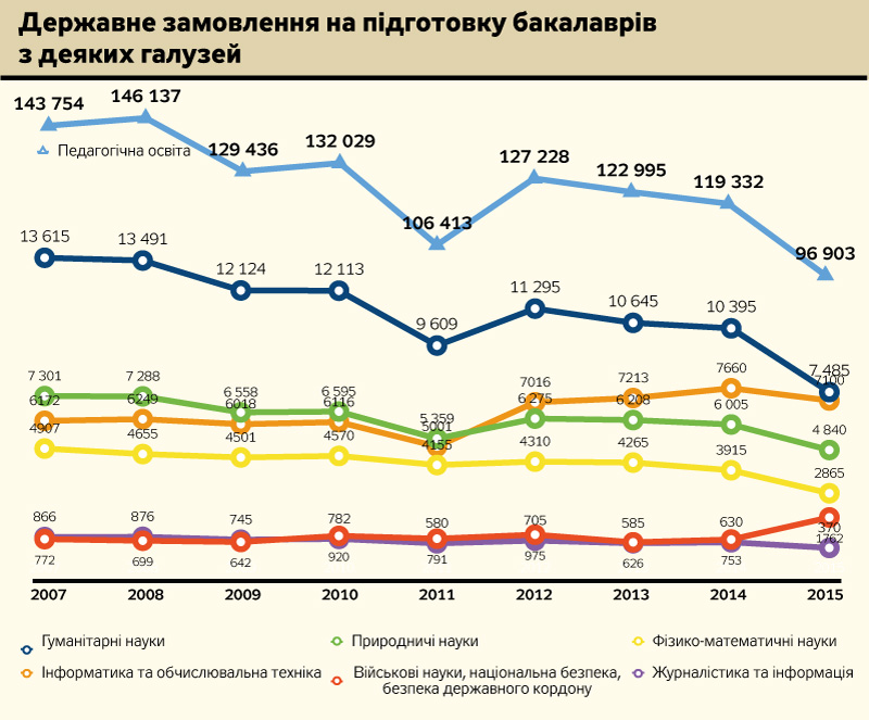 Цікаво проаналізувати, як змінилося, порівняно з минулими роками, державне замовлення на підготовку бакалаврів за освітніми галузями. Певною мірою це свідчить про державні пріоритети.
