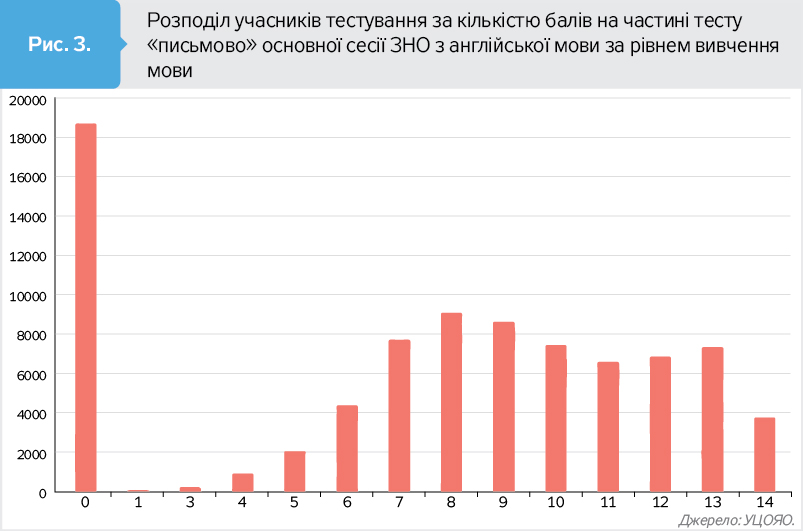 Добре впоралися із завданнями з читання. Треба було прочитати текст і дати відповідь на запитання. Непогано виконали завдання з розділу "використання мови". Це правила правопису, вживання мовних конструкцій тощо. А результати виконання частини "письмо" набагато гірші: понад 19 тисяч учасників (із 84 тисяч тих, хто складав тест) отримали нуль балів у цій частині тесту. Треба було написати висловлювання (лист) на задану тему.