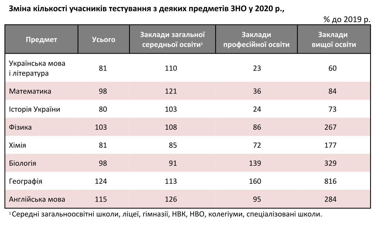 За даними Українського центру оцінювання якості освіти, у 2020 р. трохи зменшилася загальна кількість учасників ЗНО з багатьох предметів, що ілюструють дані таблиці. Але це зменшення відбулося переважно за рахунок учнів і студентів закладів професійної та вищої освіти. Наприклад, найбільш масовий тест з української мови і літератури у 2020 р. складали 10 529 учнів закладів професійної освіти, а у 2019 — 46 001.