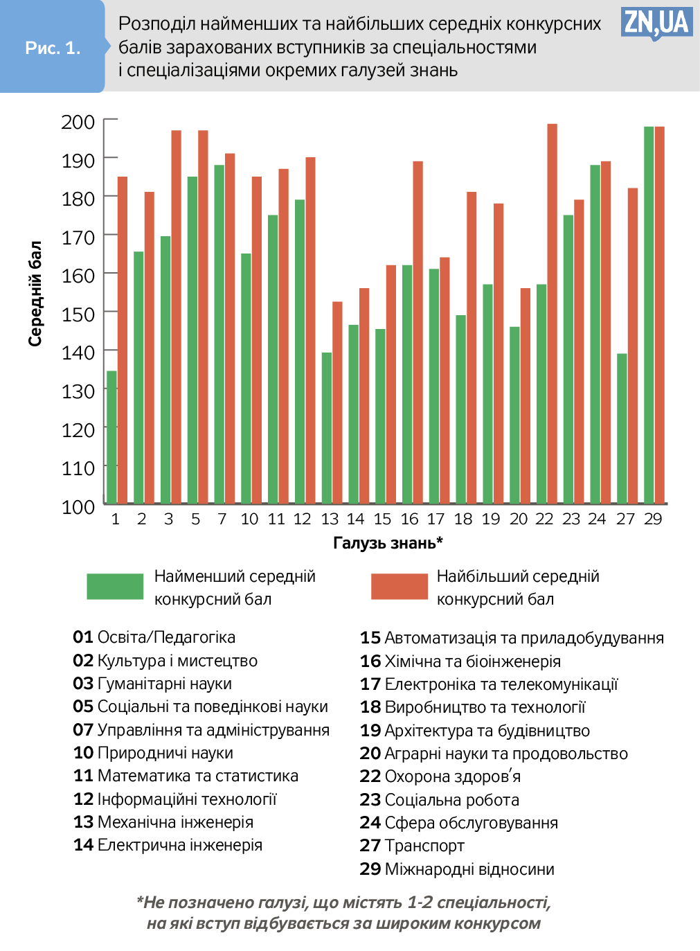 Мінімальні бали можуть залежати від випадкових факторів. Тому на діаграмі наведено також розподіл найменших і найбільших середніх конкурсних балів зарахованих вступників за спеціальностями і спеціалізаціями окремих галузей знань https://zakon.rada.gov.ua/laws/show/ru/266-2015-%D0%BF#Text (не позначено галузі, що містять 1–2 спеціальності, вступ на які відбувався за широким конкурсом).