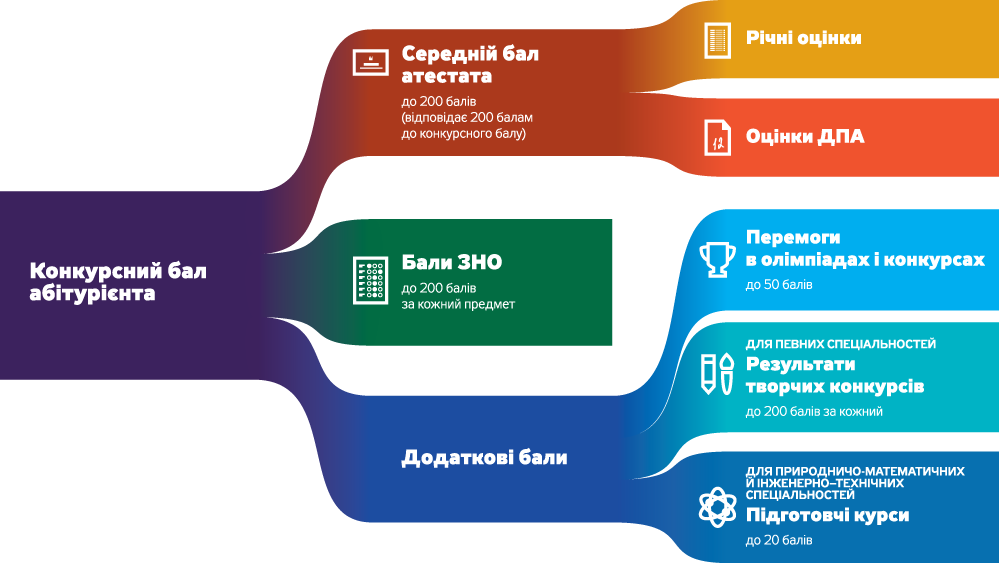 Вступить чи не вступить абітурієнт до вищого навчального закладу- прямо залежить від величини його конкурсного бала. Це своєрідна скарбничка, куди входять: середній бал атестата, додаткові бали за перемогу в конкурсах та олімпіадах, за підготовчі курси (для природничо-математичних та інженерно- технічних спеціальностей), бали сертифікатів зовнішнього незалежного тестування (ЗНО) і результати творчих конкурсів - для окремих напрямів (див. рис. на 12-й стор.). Крім двох останніх компонентів, решта балів набираються в школі. Тому дуже важливо розуміти, які є можливості для отримання максимального результату.