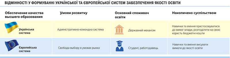 Українська система забезпечення якості освіти сягає своїм корінням у радянське минуле, коли контроль якості здійснювався адміністративно-командними методами. Європейська система освіти, навпаки, формувалася в умовах природного вибору, коли вимоги до якості освіти висувають безпосередні споживачі освітніх послуг - галузі, роботодавці, студенти.