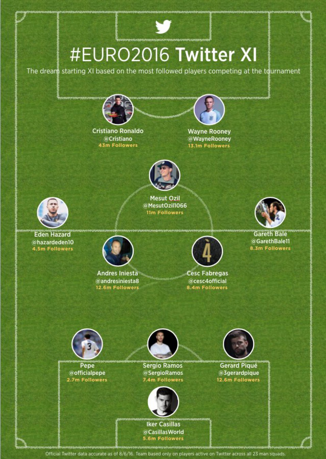 Twitter склав символічну збірну Євро-2016 з гравців, у яких найбільше фолловерів у популярному мікроблозі.