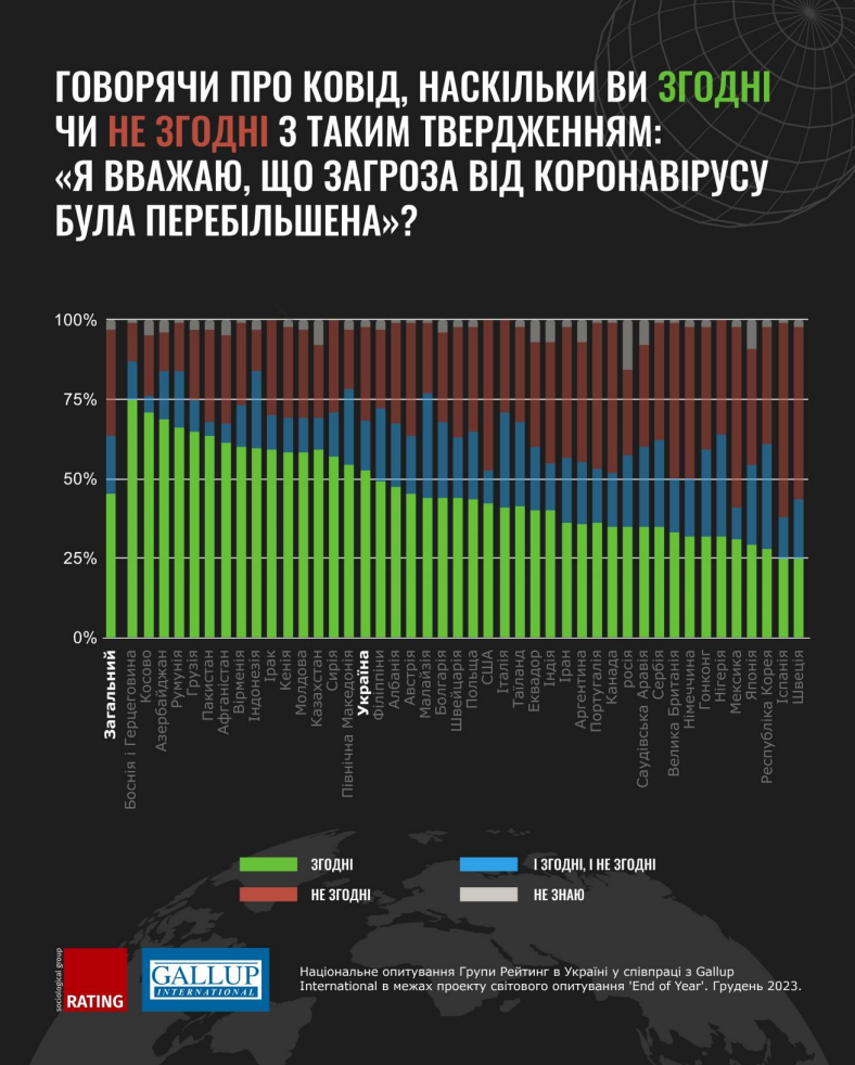 В світі майже половина людей вважають, що загроза від коронавірусу була перебільшена, а ще чверть мають невизначену позицію «і згодні, і не згодні». Такі дані спільного соціологічного опитування з інститутом досліджень Gallup International опублікувала Соціологічна Група Рейтинг.