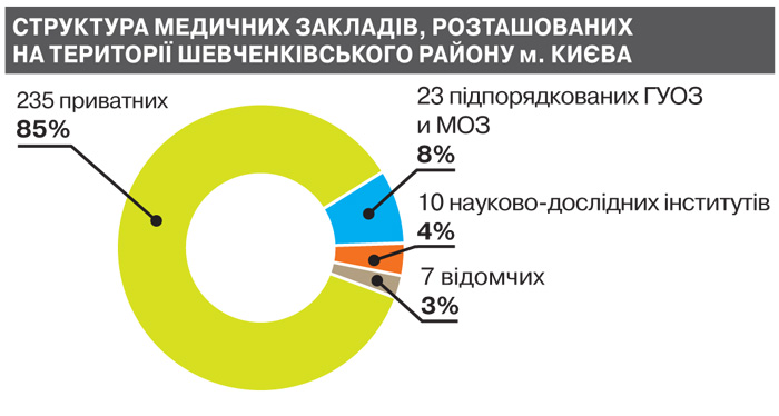 Стратегія розвитку столиці включає й проведення медичної реформи, яка має забезпечити "збільшення тривалості життя киян на 7 років - з 71–72 до 78–79". Мінздоров'я, у свою чергу, обіцяло, що поліпшення медичної допомоги люди реально відчують наприкінці 2012 - початку 2013 р. Цьому, зокрема, сприятиме збільшення подушного фінансування, яке відбудеться після скорочення зайвих ліжко-місць і закриття лікарень. А чи багато насправді "зайвих"? Структура медичних закладів того ж таки Шевченківського району має сьогодні такий вигляд: 85% - приватні, 8% - належать МОЗ та місту, 3% - відомчі, 4% - інститутські клініки.