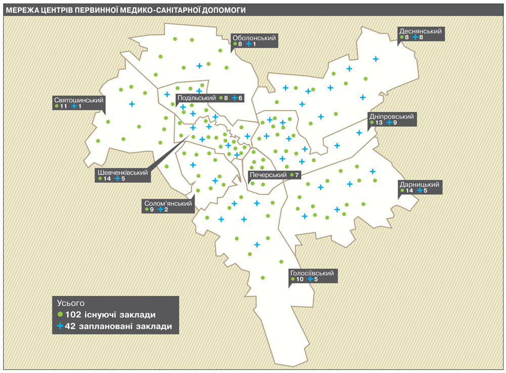 Чиновники заявляють, що в столиці в ході реформування не закриватимуть лікарень і не скорочуватимуть лікарів. Але на офіційному сайті КДМА легко знайти матеріали, в яких медичну реформу розписано по кроках. Це не тільки робочі плани і таблиці, а й доповіді, з якими начальство виступало на колегіях і нарадах. За статистикою, діюча мережа первинної медичної допомоги столиці включає 102 заклади, а залишиться - 42. Наприклад, у Голосіївському районі з 10 залишать 5, у Шевченківському з 14 - 5, а у Святошинському з 11 - усього 1.