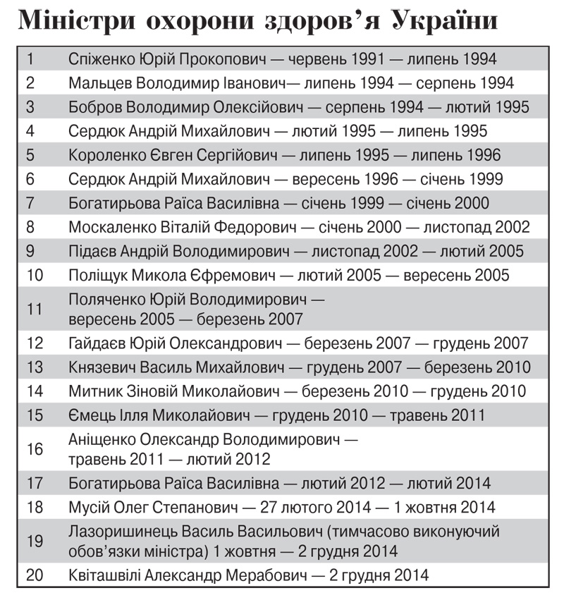 Є у нас досягнення, гідне книги рекордів: за 24 роки в незалежній Україні поміняли 18 міністрів охорони здоров'я. Дев'ятнадцятий - Александр Квіташвілі, не чекаючи, поки його знімуть, сам написав заяву про відставку. Це викликало значне пожвавлення не тільки в медичних і фармацевтичних, а й у політичних колах.