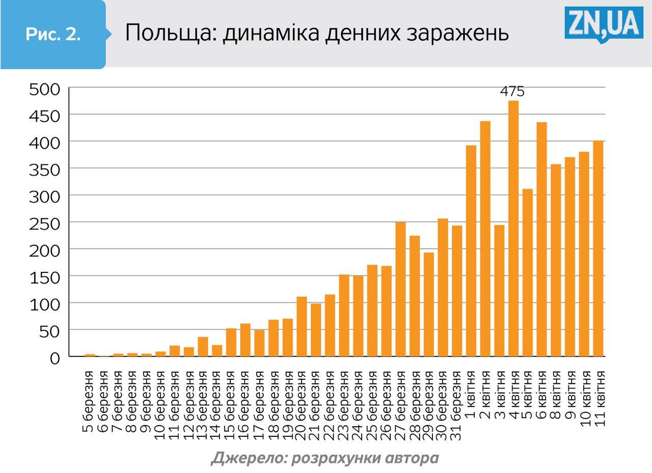 Здасться дивним, але коли 5 квітня в Польщі було зафіксовано денний максимум нових захворювань (475), зазначена пропорція там збіглася з показником Кореї - 0,01%. І хоча пояснити цей збіг відверто складно, він вселяє обережний оптимізм. Бо в цьому разі віднесення піку наших захворювань на другу половину квітня знаходить хоч якесь пояснення. Однак цей оптимізм справді обережний, оскільки в останні дні в Польщі знову спостерігається щільне зростання добових заражень (див. рис. 2). Через що неясно, коли там, нарешті, сформується усталений тренд на їх зниження.