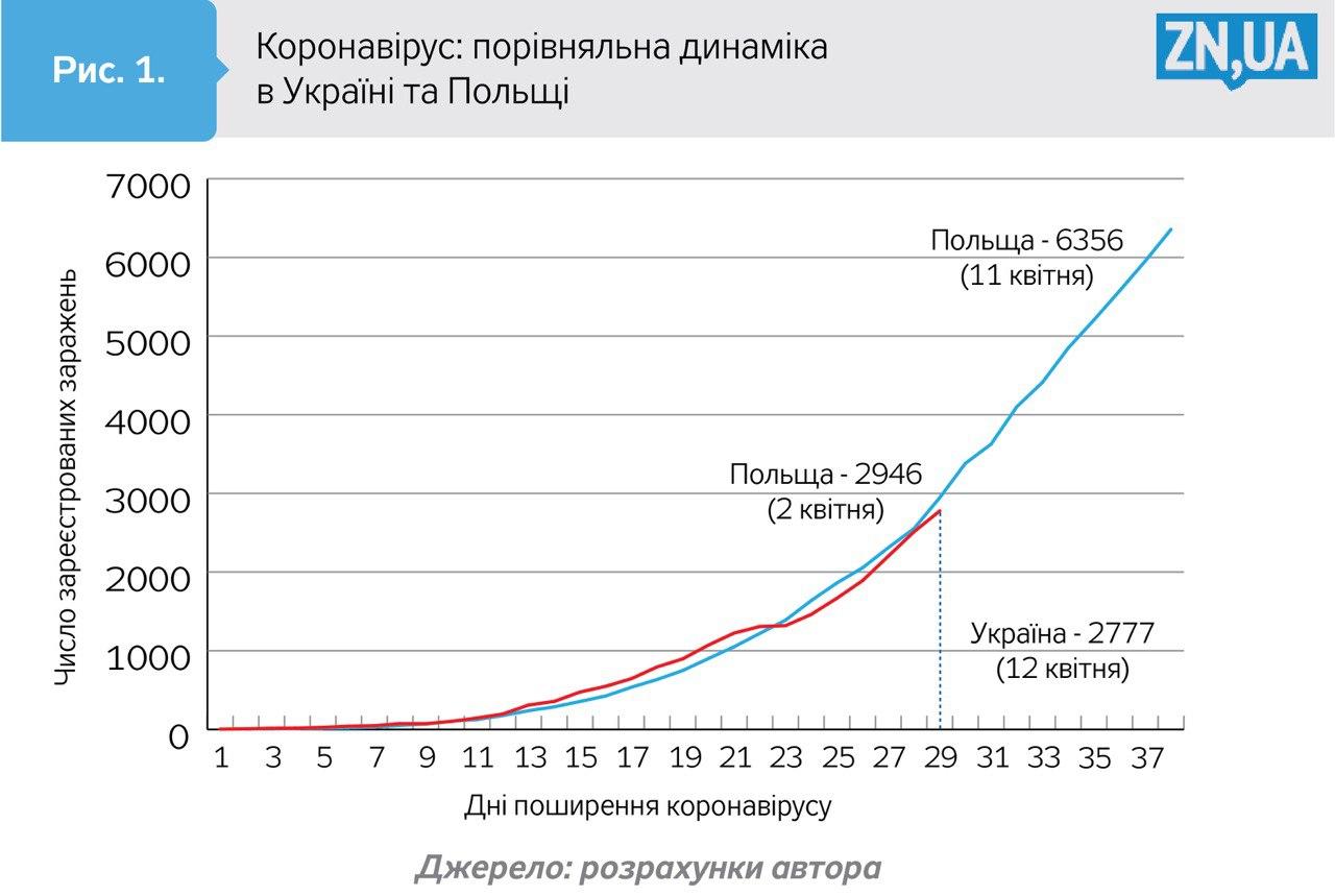 Якщо відкинути цей лаг у десять днів, виходить примітна картина поширення хвороби в Україні та країні, яка надала притулок 1,5 мільйона її трудових мігрантів: протягом останніх 29 днів ми мало не слід у слід повторюємо статистику захворювань Польщі (див. рис. 1). Відмінність поки що лише в тому, що відбувається це зі приблизним лагом у десять днів. Так, 12 квітня в Україні загальна кількість заражень досягнула 2777. У Польщі така ситуація спостерігалася 2 квітня (2946), тоді як до 11 квітня кількість захворювань там зросла вже до 6356 випадків.