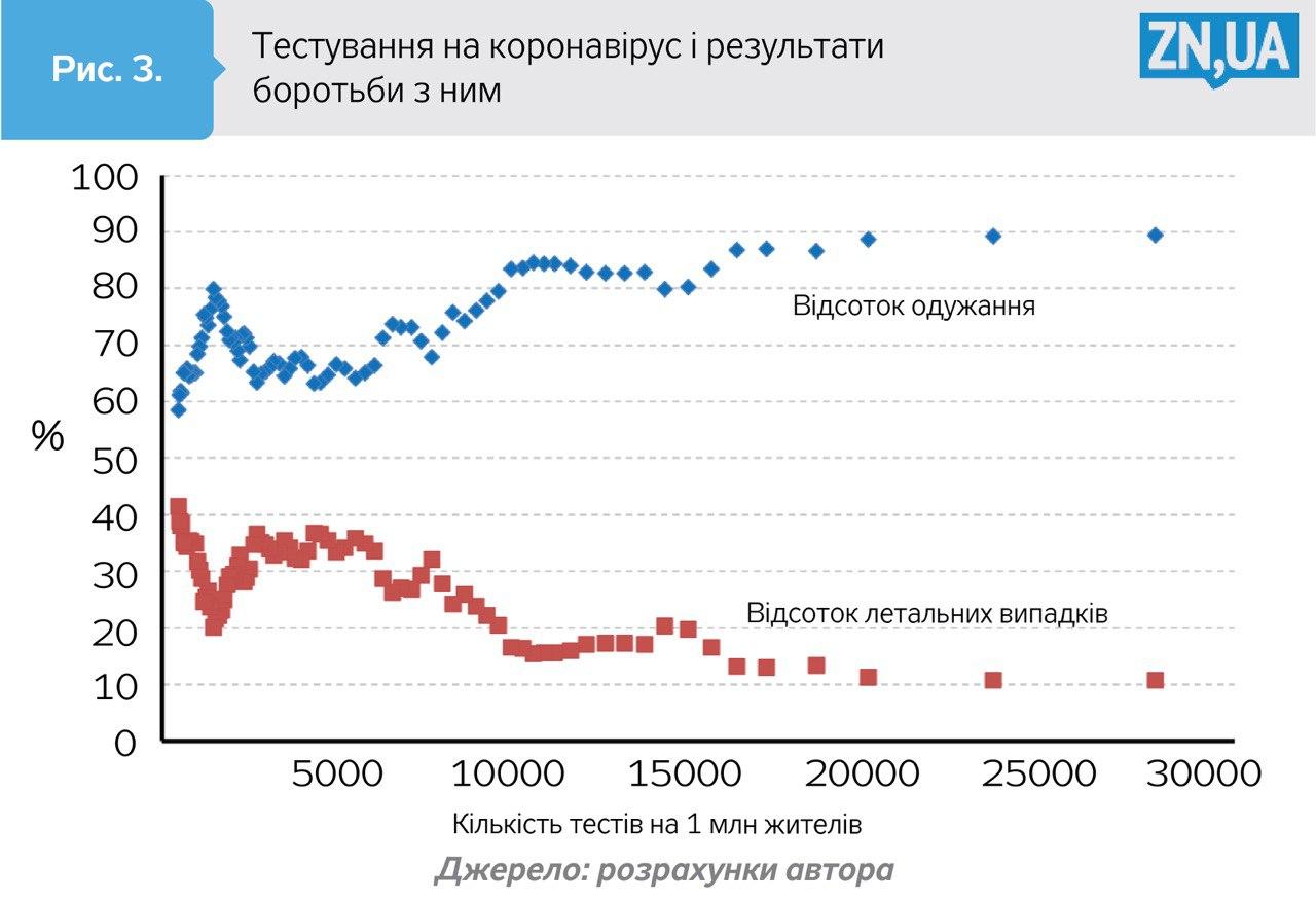 Залежність досить проста: що вища щільність тестування, то реальніший шанс залишитися живим. А саме: при зростанні кількості тестів з 1 тисячі до 20 тисяч (на мільйон жителів) середній відсоток одужання збільшується з 70 до 90%. І навпаки, що менше проводиться тестів і нижче розуміння реальних загроз від зараження, то вища ймовірність летального результату. Так, у благополучних країнах із високим рівнем розвитку промислових і медичних технологій вона становить 10% і менше (дані на графіку усереднено), а в країнах, подібних до України (700 тестів на мільйон жителів), - наближається до 40%.