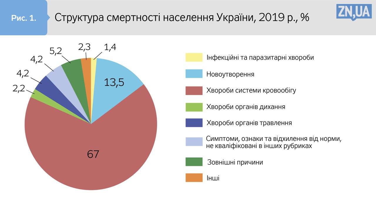 Ми маємо дані Держстату України щодо смертності в Україні за 2019 рік. Якими ж були причини понад 580 тисяч смертей наших співвітчизників (коли бути точними — 581114)? Як і раніше, у 2019 році на чільному місці — серцево-судинні захворювання, друге й третє місця посідають новоутворення та зовнішні причини смерті, тобто травми, отруєння і нещасні випадки. Наступні за значущістю у топ-5 основних причин — хвороби органів травлення та хвороби органів дихання (рис. 1).