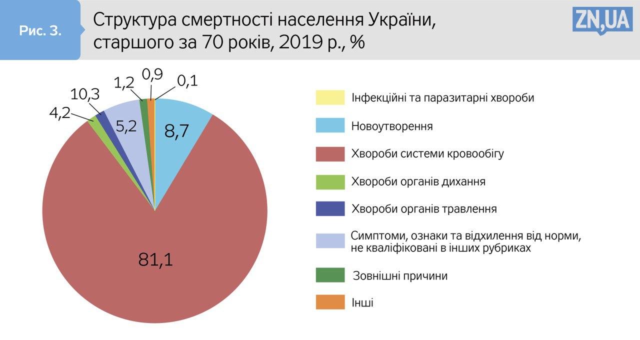 Ми розуміємо, що з віком зазвичай ризик захворіти, особливо на хронічні неінфекційні захворювання, зростає. На жаль, спектр захворювань і патологічних станів розширюється. Однак, якщо розглянути причини смерті людей поважного віку (за 70 років), виявляється, що понад 80% смертей віднесено до серцево-судинних (рис. 3). Що, вони не страждали на інші, які теж могли б спричинити смерть? Не вірю! Ось хоча б на рак, — але, як бачимо, частка осіб 70+, які померли від новоутворень, істотно менша, ніж для всього населення. Натомість у Швеції в інтервалі 70–74 роки, наприклад, 41% смертей зумовлений новоутвореннями. І це правдоподібно, адже ризик онкологічної патології підвищується з віком…