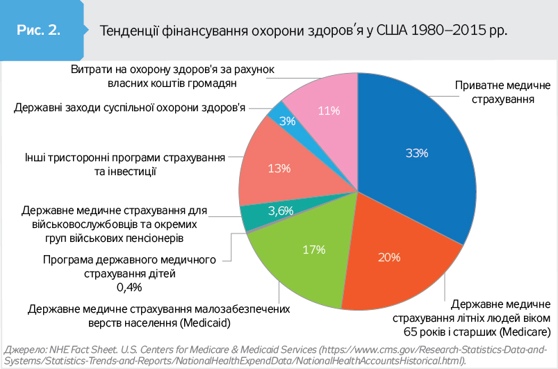 Модель функціонування та фінансування системи охорони здоров'я у США побудована на широкій політичній, адміністративній і ринковій децентралізації й домінуванні приватного медичного страхування, питома вага якого у фінансування галузі становить близько 33 % загальних витрат на охорону здоров'я (1,07 трлн дол.США) і є єдиною формою страхового покриття для осіб, котрі не залучені до державних програм медичного страхування.