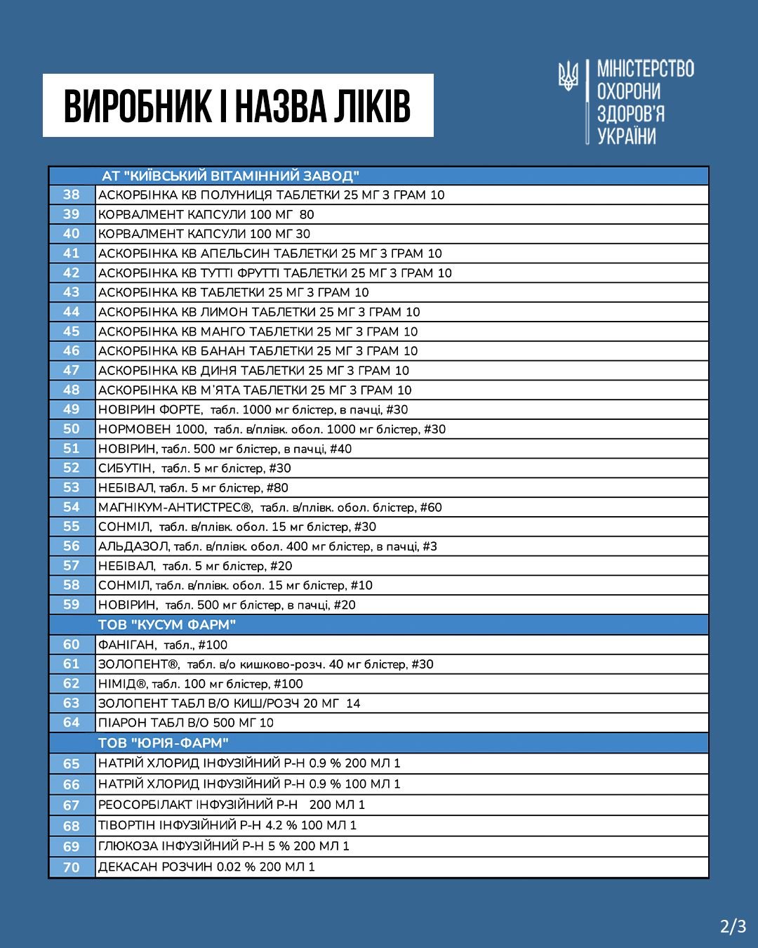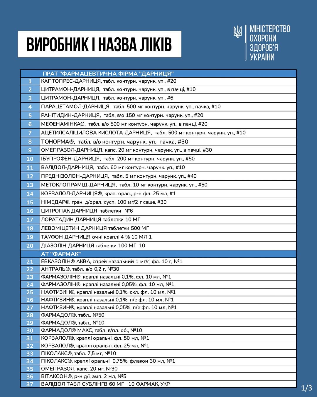 “Зокрема у списку ліки, які застосовуються при кашлі та застудних захворюваннях, антигістамінні, протизапальні та протиревматичні препарати, вітаміни та мікроелементи, ліки проти тиску, противиразкові засоби, заспокійливі, очні краплі, назальні спреї та інші”, – йдеться у повідомленні пресслужби МОЗу.