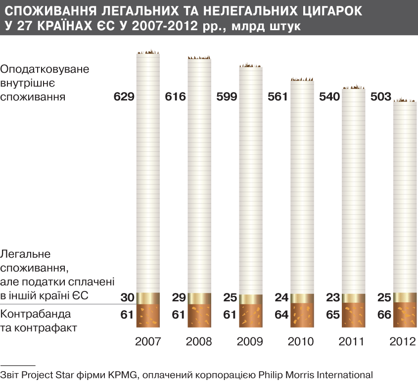 Згідно з квартальними звітами Philip Morris International, у січні-червні 2013 р. ринок сигарет в Україні зменшився до 37 млрд, що на 4,5 млрд менше, ніж у січні-червні 2012-го. Передбачуване ж зростання нелегального обороту становило лише 1 млрд сигарет за півроку, але й ця оцінка, якщо уважно придивитися, дуже завищена.