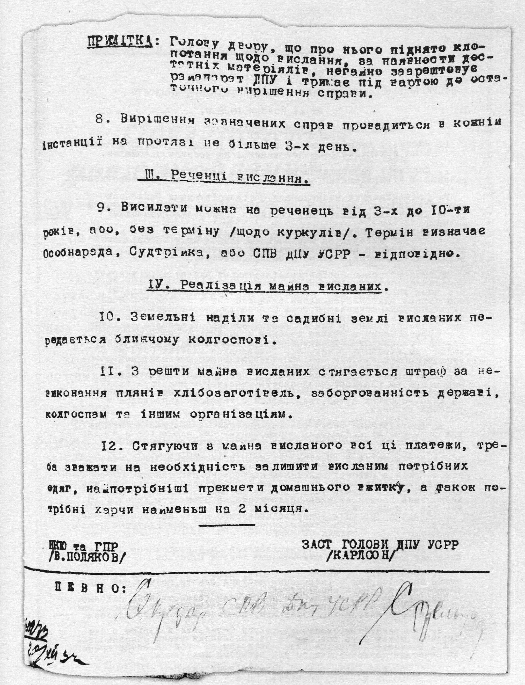 Відповідь Сталіна не забарилася. Вже 22 січня 1933 р. ЦК ВКП(б) і РНК СРСР видали постанову за № 65/ш, якою практично прирікали на голодну смерть українських селян. Ось лише частина її преамбули: "Ростов-Дон, Харьков, Воронеж, Смоленск, Сталинград, Самара. До ЦК ВКП и СНК дошли сведения, что на Кубани и Украине начался массовый выезд крестьян "за хлебом" в ЦЧО (Центральный Черноземный округ - С.М.), на Волгу, Московскую обл., Западную обл., Белоруссию. ЦК ВКП и Совнарком СССР не сомневаются, что этот выезд из Украины в прошлом году организован врагами Советской власти, эсерами и агентами Польши с целью агитации "через крестьян" в северных районах СССР против колхозов и вообще против Советской власти. В прошлом году партийные и советские и чекистские органы Украины прозевали эту контрреволюционную затею…". В 3-му пункті постанови, підписаної Й.Сталіним і В.Молотовим, пряма вказівка каральним органам: "ЦК ВКП и Совнарком предписывают ПП ОГПУ Московской обл., ЦЧО, Западной обл., Белоруссии, Нижней Волги арестовывать пробравшихся на север "крестьян" Украины и Северного Кавказа, и после того, как будут отобраны контрреволюционные элементы, выдворять остальных в места их жительства".
