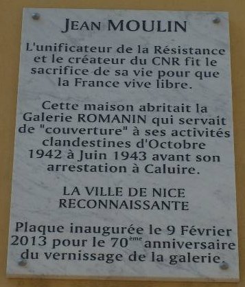 Дати скрізь різні, але всі з періоду 1943–1944 років - часу, коли Ніццу окупували німці. До цього, з початку війни, тут були італійці, проти яких французькі бойові партизанські групи практично не діяли. Ба більше, у самому центрі міста майже рік знаходилася штаб-квартира очільника Національної ради Опору легендарного Жана Мулена - аж доти, коли його випадково заарештувала в Ліоні поліція режиму Віші. Мулен, який до війни займався живописом і торгував картинами, замаскував свій сховок під художню галерею і зухвало назвав її своїм підпільним псевдо - Романен. Нині цей двоповерховий будинок на вулиці з символічною назвою rue de France прикрашає меморіальна дошка, встановлена вдячною Ніццою у зв'язку з 70-річчям відкриття цієї галереї.