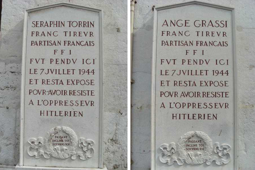 Вони нікого не виказали. За це їх убили й виставили на кілька годин на загальний огляд - щоб була наука живим. Тепер їхні імена на двох мармурових дошках, симетрично розташованих на завжди жвавому перехресті - Анж-Грассі й Серафен-Торрен: "Перехожий, уклонися і згадай". Щороку 7 липня тут відбувається пам'ятна церемонія, під час якої переможець конкурсу зачитує написану на їхню честь промову.