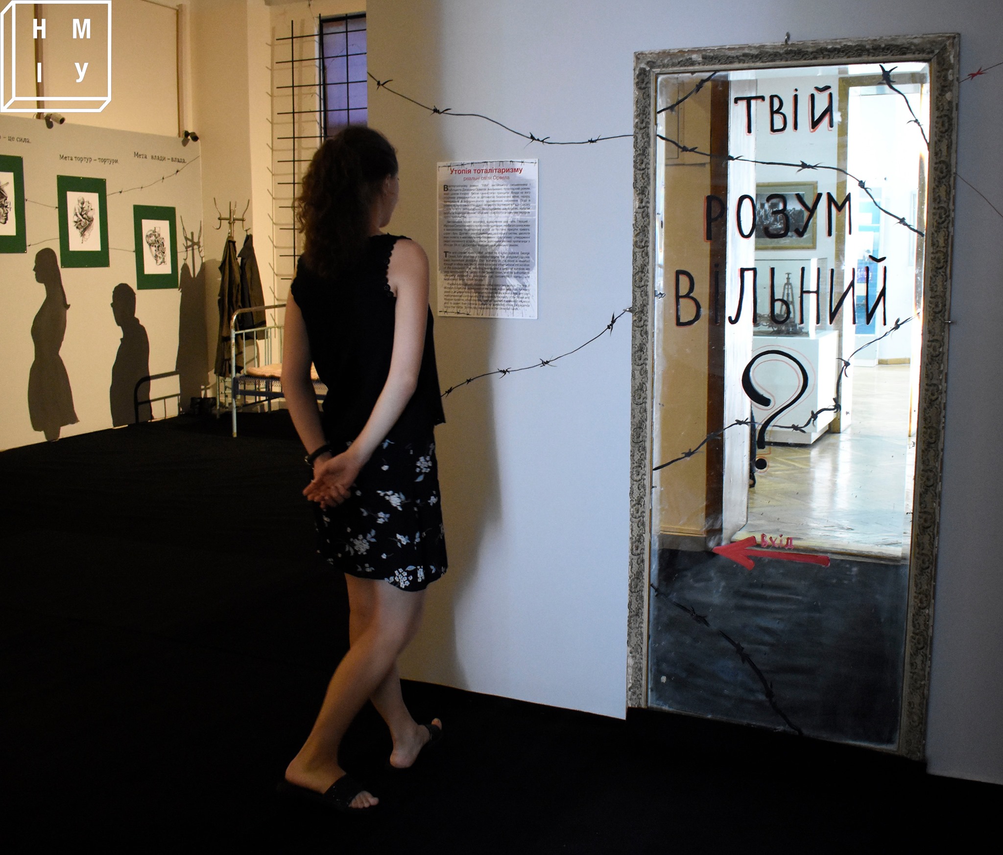 "Виставковий проєкт візуалізує для відвідувача два світи", - йдеться у буклеті виставки. Перший - світ Вінстона Сміта, головного героя роману Джорджа Орвелла "1984". Другий світ - реалії радянської і нинішньої російської систем, що вбачають свою місію в максимальному розширенні зон впливу та утвердженні злочинного устрою через відповідну масову пропаганду… Заходжу до виставкової зали. Тісний передпокій. Під написом на дзеркалі "Твій розум вільний?" двері обабіч. З одного боку чуються голоси героїв екранізованого роману Орвелла, з другого лунають бравурні радянські марші впереміш із байкою про "распятого мальчіка" та іншими перлами сучасної російської пропаганди. Іду спершу до Орвелла. Мене зустрічають знеособлені чорно-сірі постаті на стінах, прихована камера телеекрана, що дозволяє підглянути - що ж то робиться в тоталітарному світі. Впадають в око ілюстрації до роману "1984" молодого митця Андрія Шостака, що передають біль і розпач безвиході. Поряд цитати з Орвелла: "Війна - це мир", "Правда - це брехня", "Свобода - це рабство". У кутку - кімнатка головного героя роману Вінстона Сміта. "Міністерство достатку" забезпечило йому мінімальне: дах над головою, залізне рипуче ліжко зі старим ватним матрацом, трохи їжі. На столі скромний зошит, а саме щоденник Вінстона. Поряд - пляшчина з етикеткою "Перемога" і однойменна пачка цигарок. У таких умовах людина не може думати про щось більше і дякує за "дарунки" партії, а шматочок шоколаду розцінює як немислиме благо.
