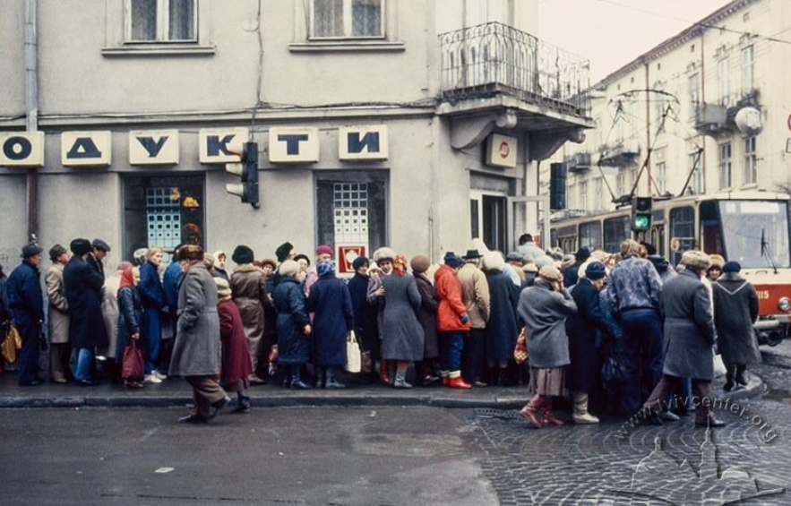 У кутку стояли вітрини-холодильники, але велика брила масла лежала за ними. Між вітриною і брилою масла - продавчиня, яка всім своїм виглядом давала знати, що вона і є "Родіна-мать". Масло вона різала металевою струною і загортала в брунатний папір. Вітрини-холодильники радше були окрасою інтер'єру: через віялові вимкнення електрики (ми вже забули що це таке!) вони не працювали годинами. Якось я купив польської вареної ковбаси з цього холодильника, так вона вибухнула в мене на кухні.